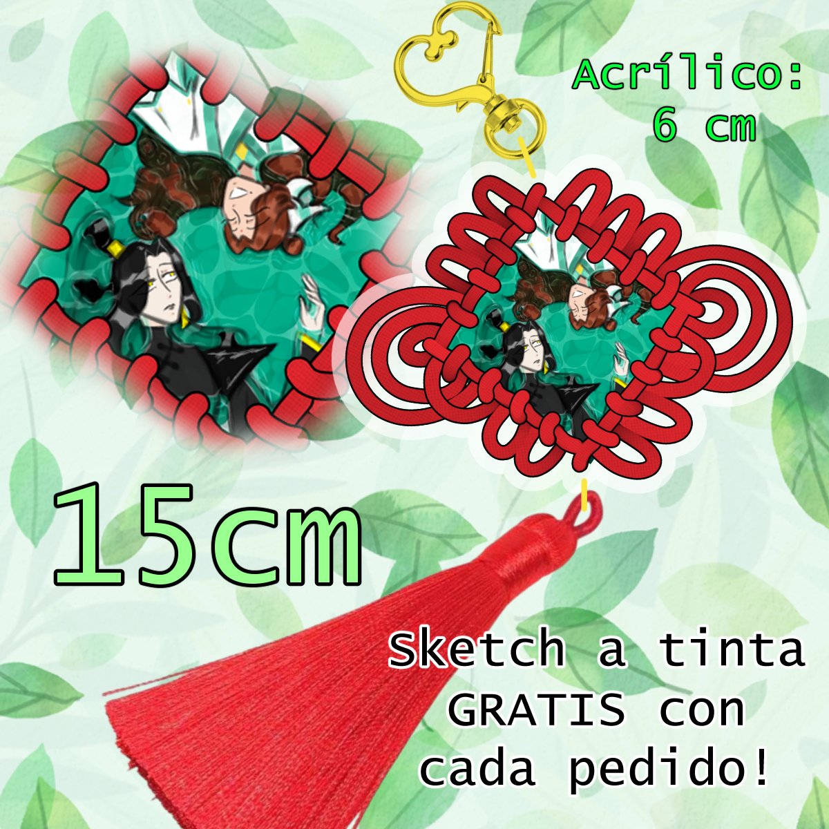 La parte acrílica sola mide 6 cm en la parte más amplia, la borla 8 cm, todo junto al enganche de corazón son unos 15 cm.